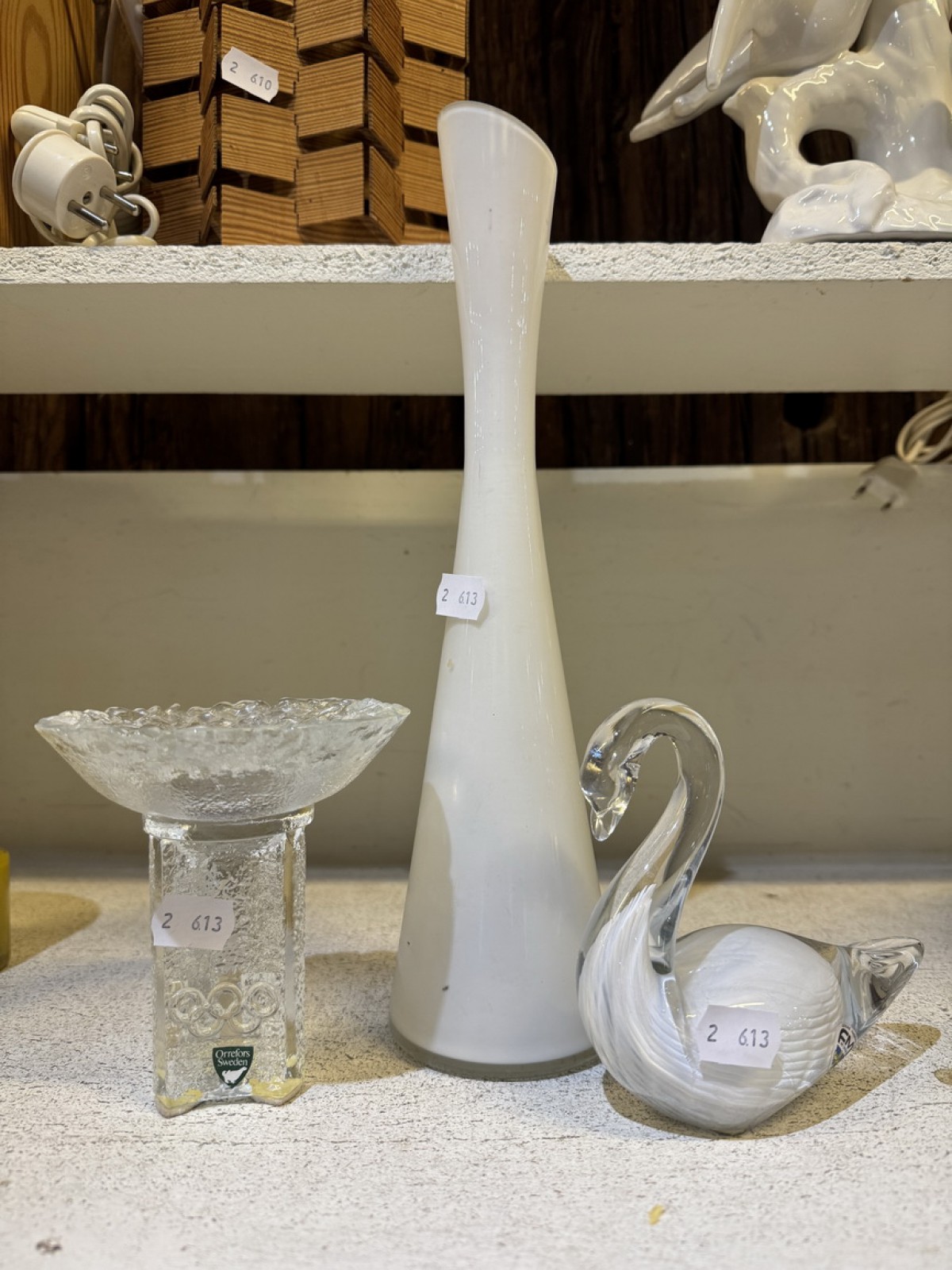 Orrefors ljuslykta, glasvas och svan
